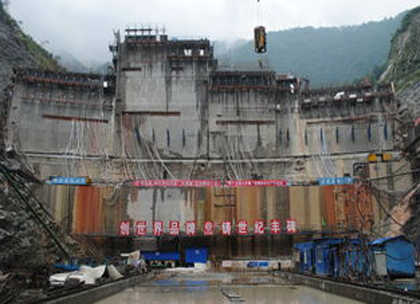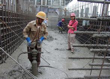 C60高标号混凝土,其粗骨料粒径30mm以下,级配合理;砂率39%,中细砂;以及水泥用量均能达到泵送要求。但受强度的制约,其水灰比在O.2-0.3之间,致使坍落度为12cm左右,影响混凝土泵送时的流动性,增大了阻力。增加砂率能提高其可泵性,但影响了强度,达不到设计施工要求。因此,解决这一问题的唯一途径就是加减水剂,既不影响强度,又可增大坍落度??急盟褪蔽醇蛹跛?,泵送压力为26-28MPa,泵送速度慢、效果差。如果长时间高压输送,会影响混凝土泵的稳定性和可靠性。后来掺入一定量的减水剂(NF-2),坍落度达到18-20m,泵送压力明显下降,仅为18MPa左右,使泵送工效提高约一倍。另外,在泵送过程中,还应提醒操作人员:料斗内的混凝土务必在搅拌轴中线以上,否则会导致吸空造成混凝土四处飞溅伤人,或由于吸空、气体压缩而造成堵管。