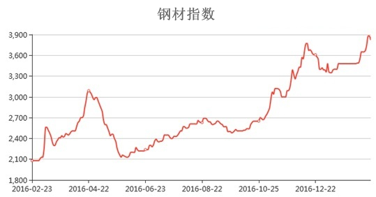 2016年2月底至2016年12月底国内钢铁西本指数图表