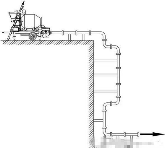 二、当配管的倾斜度大于4°-7°时,应在向下倾斜配管的前端设置相当于垂直落差的5倍以上长度的水平管(或3倍落差的水平管加一段软管〕,利用其摩擦阻力阻止混凝土的自流。