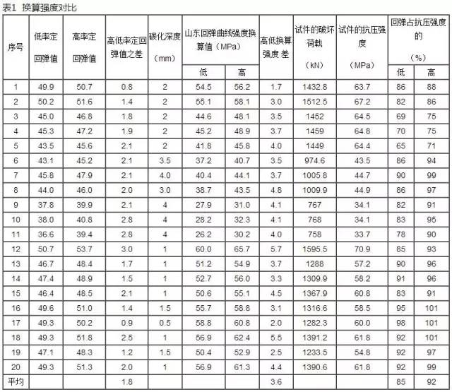 由于在测定回弹曲线时所制做的试块不够标准,致使试块的受压面出现中心起鼓,也有的出现中心凹陷,压出的强度较低?;氐窃诼识ㄊ笨刂圃?0±2范围内,也加大了误差值。对回弹仪在不同率定值的情况下和采用不同的回弹曲线所换算出的强度进行比对,所得结果见表1。