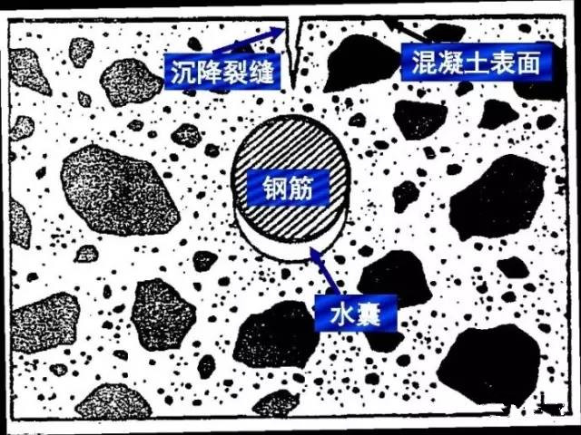 在混凝土粗骨料、钢筋周围形成水囊,随着水分的逐渐挥发形成空隙,从而影响混凝土的致密性、骨料的界面强度以及混凝土与钢筋间的握裹力,导致混凝土整体强度的降低?;炷撩谒斐伤苄允账跏且桓霾豢赡娴谋湫巍C谒鸹炷恋某两档贾禄炷敛苄粤盐?从而会降低水泥混凝土的强度。特别是泌水混凝土产生整体沉降,浇注深度大时靠近顶部的拌合物运动距离更长,沉降受到阻碍,如遇到钢筋等障碍时,则产生塑性沉降裂纹,从表面向下直至钢筋的上方。