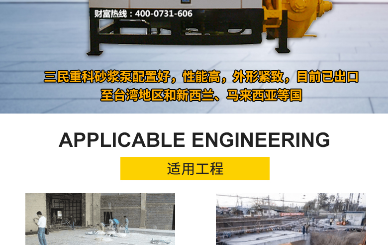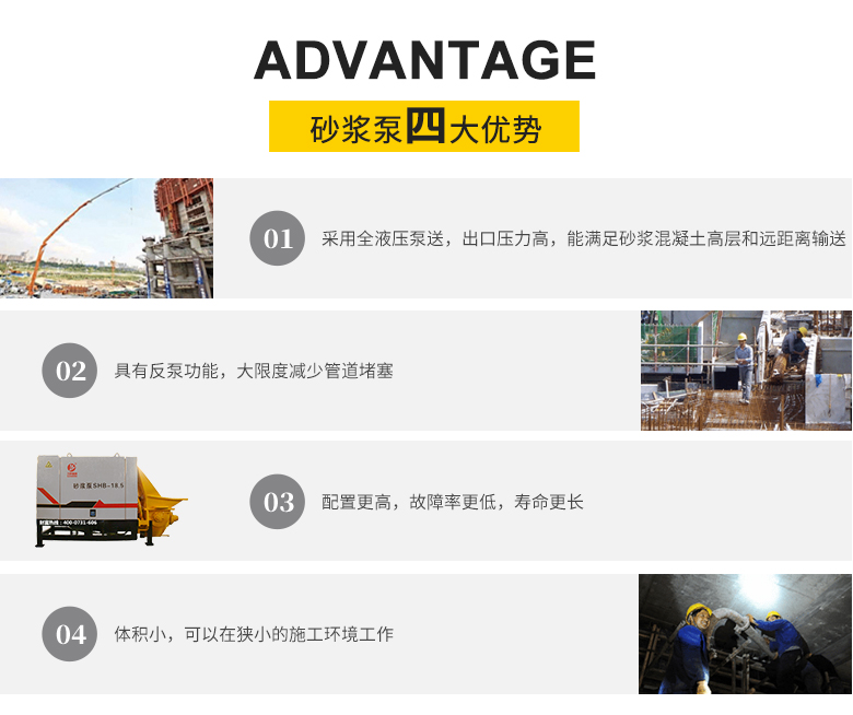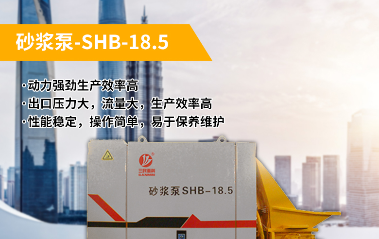 简介:三民重科研制的SHB-18.5液压型砂浆泵技术成熟、性能稳定、操作简单,易于维护保养;同时也降低了操作者的劳动强度;泵的出口压力大,流量大,生产效率高。