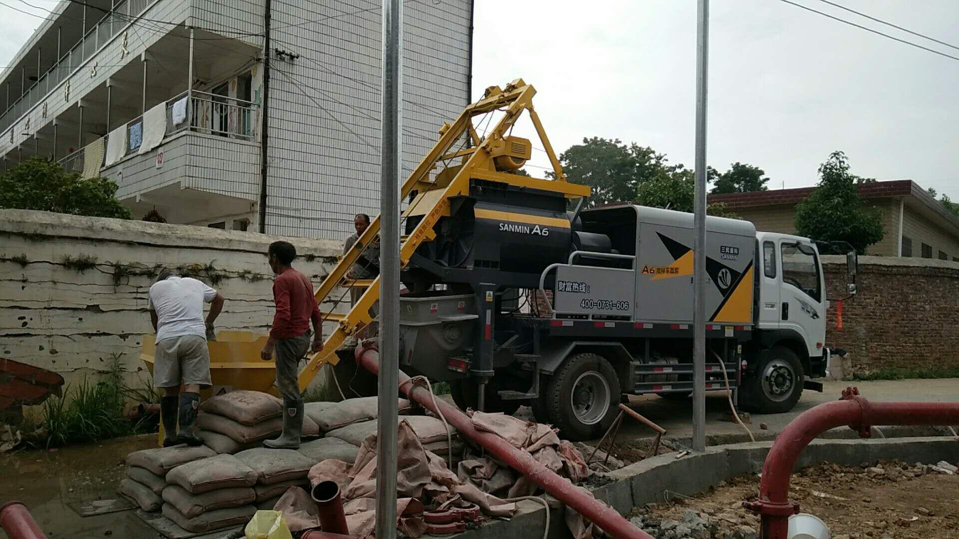 2016年7月,“尼伯特”台风给闽清塔庄镇带来特大暴雨洪灾后,三民重科混凝土泵车之搅拌车载泵在援建一线参与灾后重建。