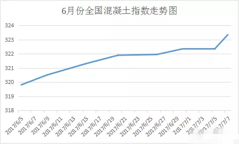 截止07月07日,混凝土价格指数为 323.35 较06月02日320.75 上涨2.6,较16年同期相比上涨54.9,