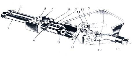 (1)(2)主油缸;(3)水箱;(4)换向装置;(5)(6)混凝土缸;(7)(8)混凝土活塞;(9)料斗;(10)分配阀;(11)摆臂;(12)(13)摆动油缸;(14)出料口 混凝土缸活塞(7、8)分别与主油缸(1、2)活塞杆连接,在主油缸液压油作用下,作往复运动时,一缸前进,则另一缸后退;混凝土缸出口与料斗连通,分配阀一端接出料口,另一端通过花键轴与摆臂联接,在摆动油缸作用下,可以左右摆动。 泵送混凝土料时,在主油缸作用下,混凝土活塞7前进,混凝土活塞8后退,同时在摆动油缸作用下,分配阀10与混凝土缸5连通,混凝土缸6与料斗连通。这样混凝土活塞8后退,便将料斗内的混凝土料吸入混凝土缸,混凝土活塞7前进,将混凝土缸内混凝土送入分配阀泵出。 当混凝土活塞(8)后退至行程终端时,触发水箱3中的换向装置4,主油缸1、2换向,同时摆动油缸12、13换向,使分配阀10与混凝土缸6连通,混凝土缸5与料斗连通,这时活塞7后退,8前进。如此循环,从而实现连续泵送。 反泵时,通过反泵操作,使处在吸入行程的混凝土缸与分配阀连通,处在推送行程的混凝土缸与料斗连通,从而将管路中的混凝土抽回料斗。 这就是我参与你们人类工程建设时的工作方式了。以后,遇到问题后可再也不能采用粗鲁的行为来报复我们了,我们工作也是很辛苦的。再说了,“快乐工作,效率翻倍”,是吧!