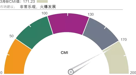 2017年3月份中国工程机械市场指数即CMI为171.23,同比增长25.66%,环比增加57.66%。2017年3月份中国工程机械市场指数比上月提高62.62点,比上年同期提高34.97点,同比、环比继续增长,而且也创下了2011年7月CMI指数创立以来的高值。