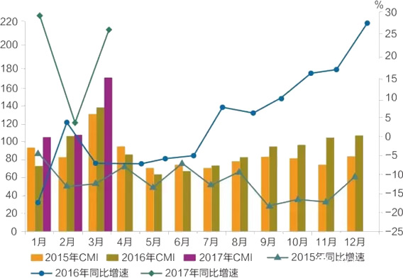 2015年-2017年CMI指数及同比增速变化趋势