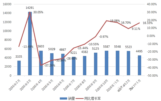 工程机械行业的回暖带动装载机销量大增,前瞻产业研究院发布的《中国装载机行业产销需求与投资预测分析报告》统计显示,2017年1月份国内25家主要装载机生产企业合计销售各类装载机共计4495台,同比大增16.33%。