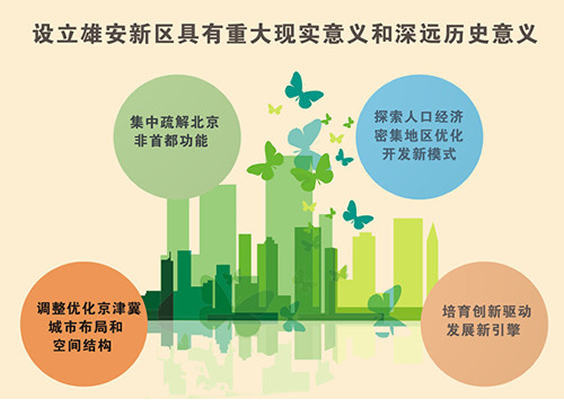中共中央决定设立雄安新区:设立雄安新区的战略目标是疏览北京非首都功能,探索人叔经济密集地区优化开发新模式,将在河北适合地段规划建设一座以新发展理念引领的现代新型城区。新区定位绿色智慧新城,打造伓美生态环境,发展高端高新产业,提供优质公共服务,构建快捷高效交通网,推进体制机制改革,扩大全方位对外开放。